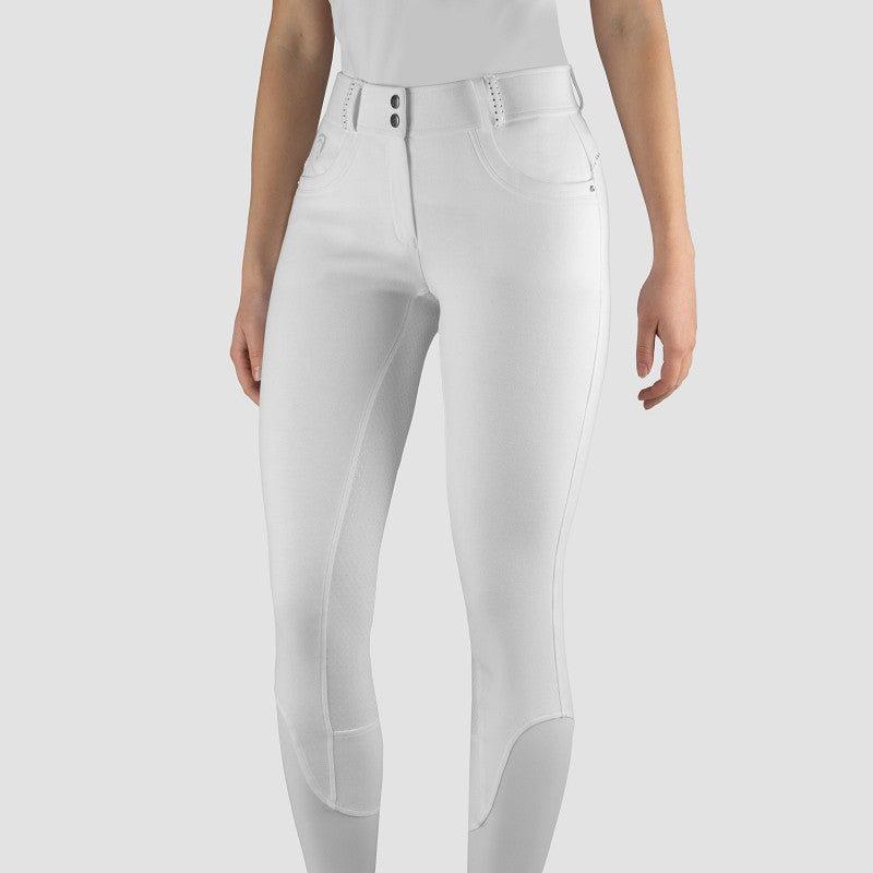 | Chic version of bestseller Annika; knitted cotton breeches with the addition of subtle crystals on the back and on the loops. The white Annalise pants are made of a slightly thicker fabric, so that the see-through of these pants is minimized. Product specifications: - Slightly higher waistband with double buttons - Elastic ankle closure, belt loops, two front pockets - Matte silicone seat - White color made of slightly thicker fabric, minimizes see-through Material: 95% Cotton, 5% elastane, knitted |